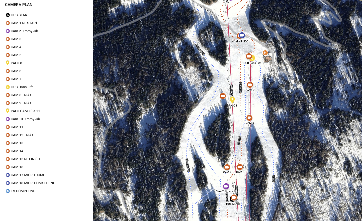 On request, I document camera positions, HUB locations and technical details directly on Google Maps — GPS coordinates, Lens specifications, platforms and rigging info — shareable with your entire team in real time.